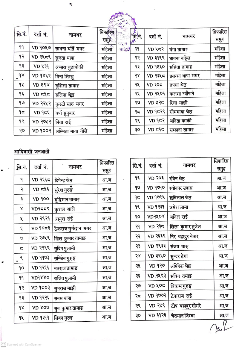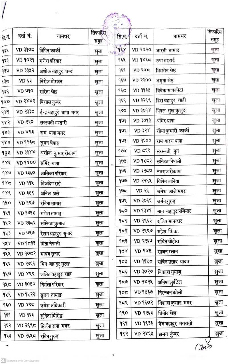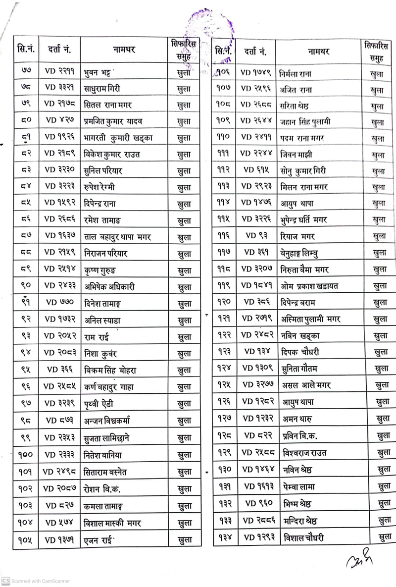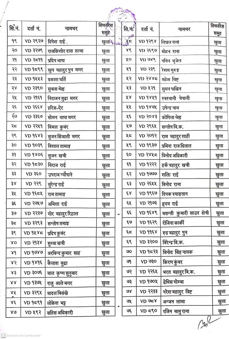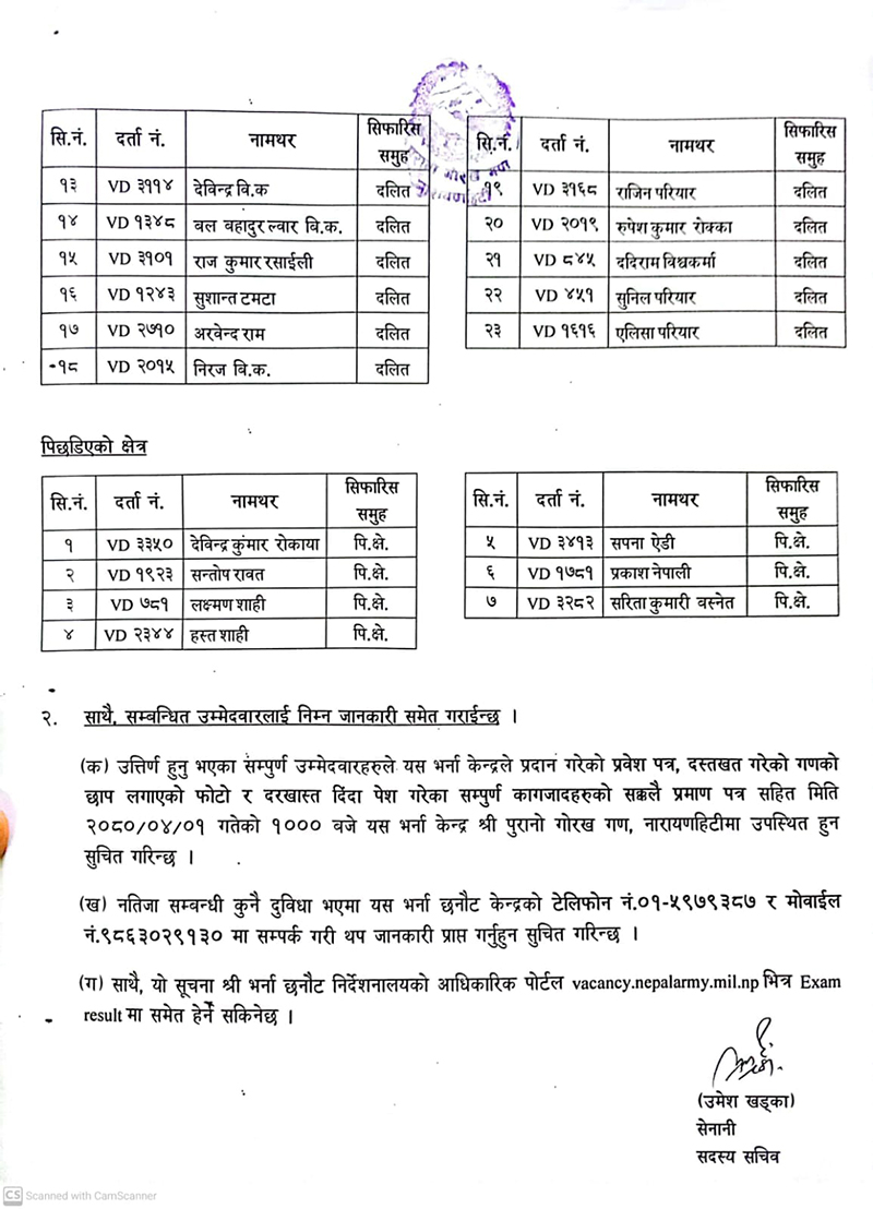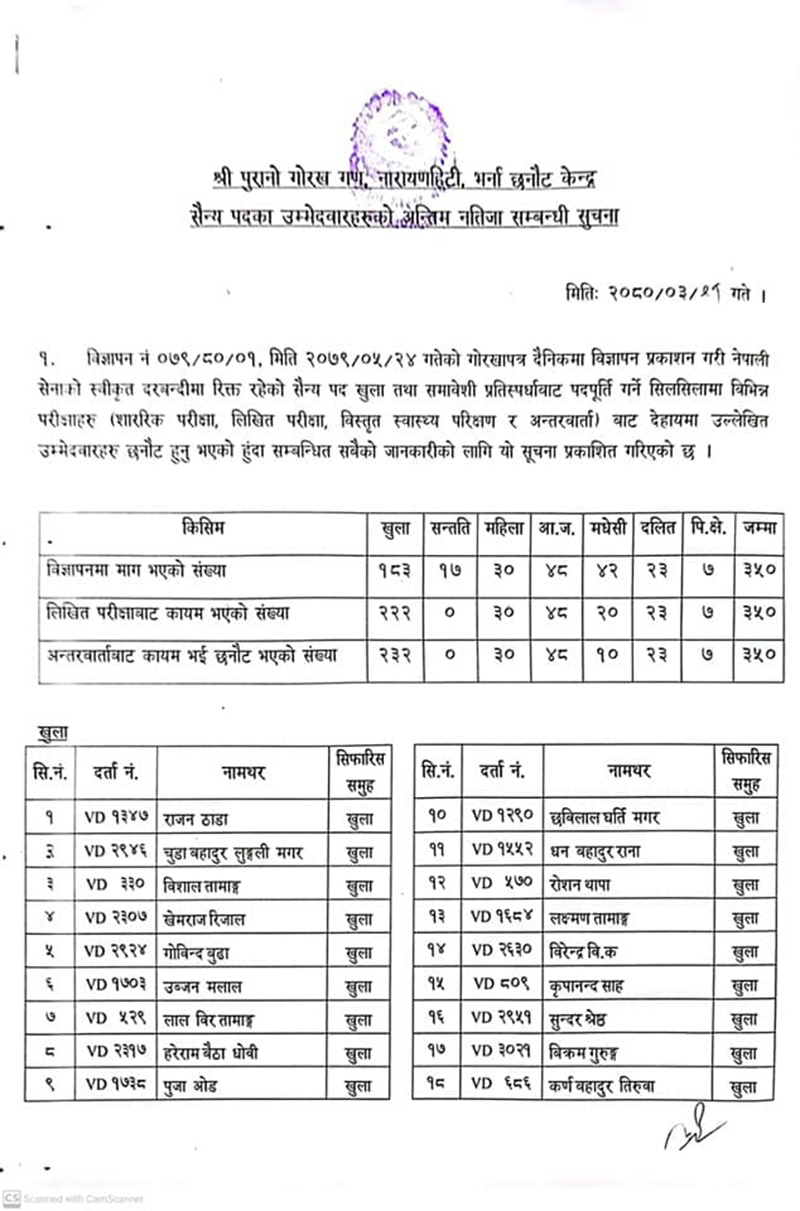 दरबन्दीमा रिक्त रहेको सैन्य पदका लागि खुला तथा समावेशी गरी निम्न उम्मेदवारहरु छनोट भएको जनाइएको छ । उत्तीर्ण भएकाहरुलाई यही साउन १ गते भर्ना केन्द्र पुरानो गोरख गण, नाराणहिटीमा प्रवेशपत्रका साथै दरखास्त दिँदा पेश गरेका सम्पूर्ण सक्कल कागजपत्रसहित उपस्थित हुनका लागि निर्देशन दिइएको छ ।