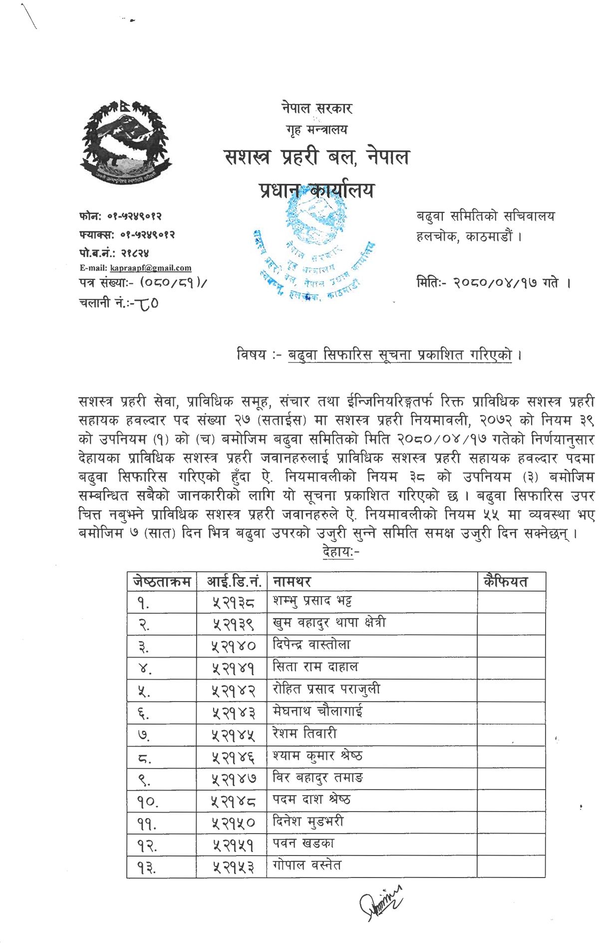 काठमाडौं । सशस्त्र प्रहरी बल नेपालले प्राविधिक तर्फका जवानहरुको बढुवा सिफारिस गरेको छ ।
