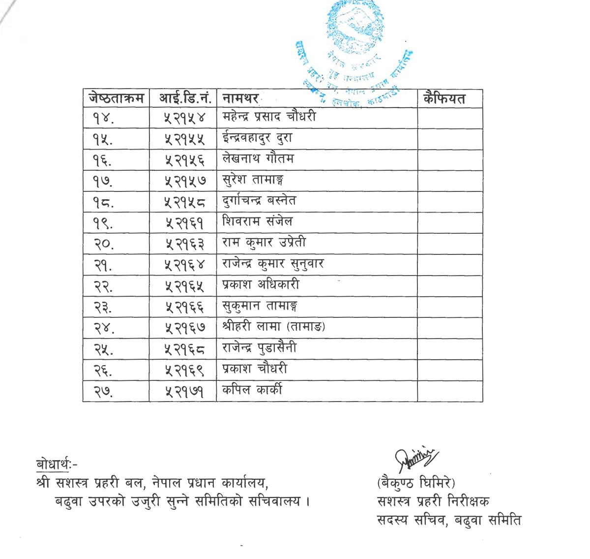यी २७ भए सशस्त्र सहायक हवल्दारका लागि बढुवा सिफारिस (नामसहित)
