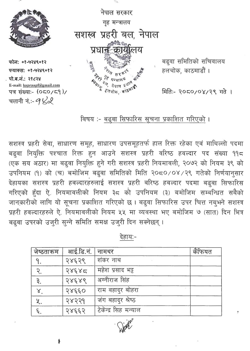 काठमाडौैं । सशस्त्र प्रहरी बलले सशस्त्र प्रहरी बरिष्ठ हवल्दारका लागि बढुवा सिफारिस गरेको छ ।