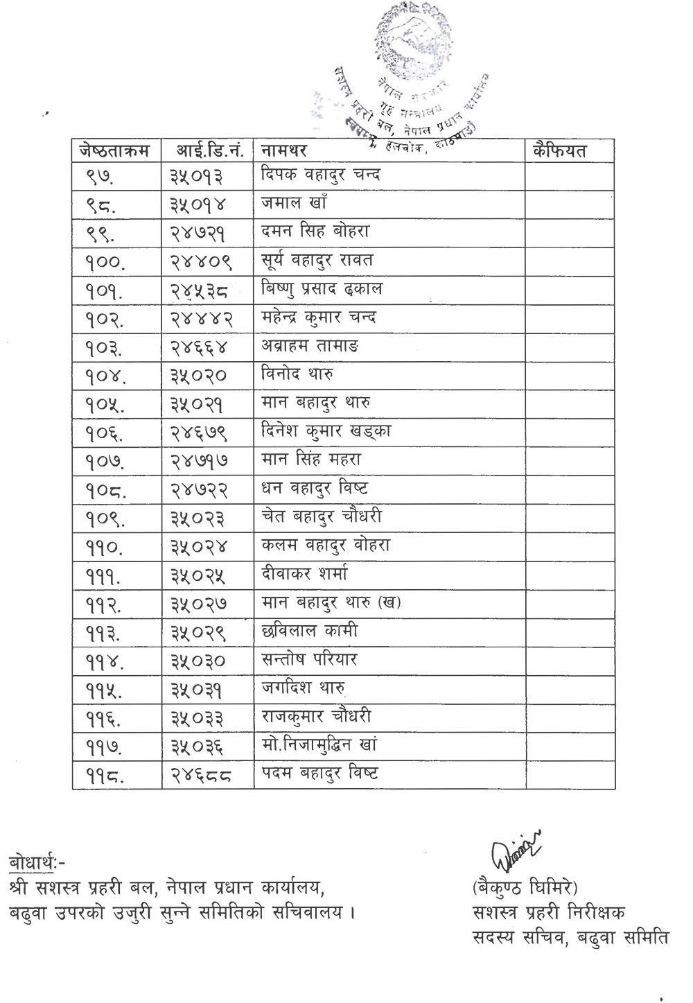 बढुवा समितिको सोमबारको निर्णयबाट एकैपटक सशस्त्र प्रहरीको साधारण समूहतर्फ खाली रहेको बरिष्ठ हवल्दार पदका लागि ११८  जनाको सिफारिस गरेको हो ।