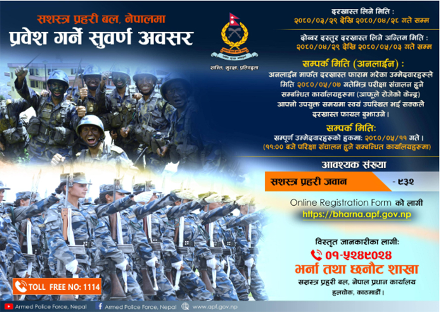 गत असार २९ गतेदेखि ९३२ पदका लागि सशस्त्रले दरखास्त आह्वान गरेको थियो । त्यसका लागि साउन २९ गतेसम्म फर्म भर्ने म्याद रहेकोमा त्यसपछि एक सातासम्मका लागि अर्थात् भोली भदौ ३ गते सम्म दोब्बर दस्तुर बुझाई फर्म भर्न सकिने सशस्त्रले जनाएको थियो ।
