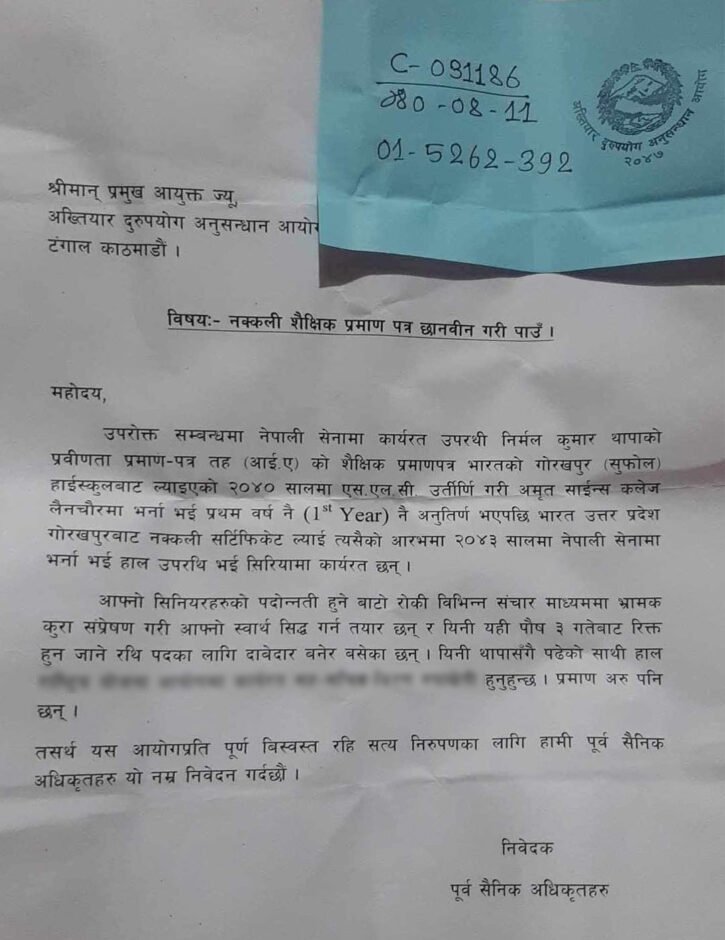 उपरथी थापाको शैक्षिक प्रमाण पत्र नक्कली भएको भन्दै छानबिनका लागि अख्तियार दुरुपयोग अनुसन्धान आयोगमा निवेदन परेपछि नेपाली सेनाका उच्चाधिकारीहरु विवादै विवादमा रहेको पुष्टी भएको छ ।