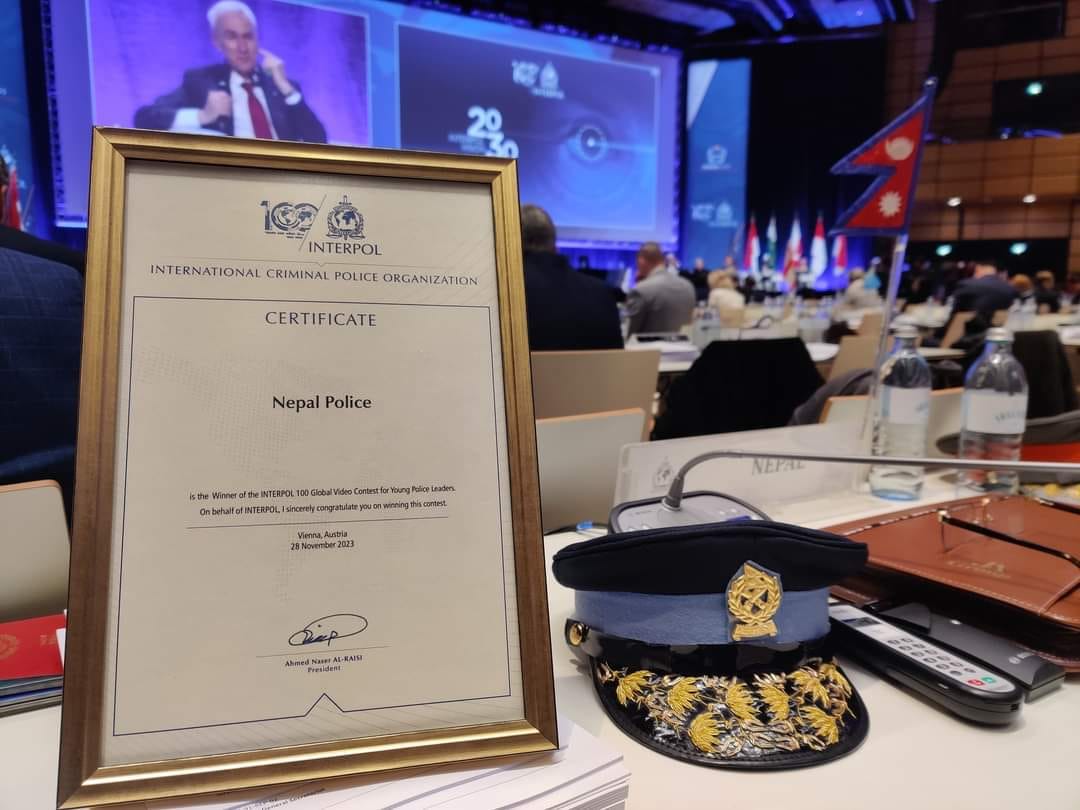 सन् २०२३ नोभेम्बर २८ देखि डिसेम्बर ०१ सम्म अष्ट्रियाको भियनामा आयोजना भईरहेको ईन्टरपोलको ९१ औं महासभाको पहिलो दिन इन्टरपोेलका प्रेसिडेन्ट मेजर जलर डा. अहमद नासिर अल रायसीबाट नेपाल प्रहरीलाई सम्मान स्वरूप प्रमाण-पत्र प्रदान गरिएको छ ।