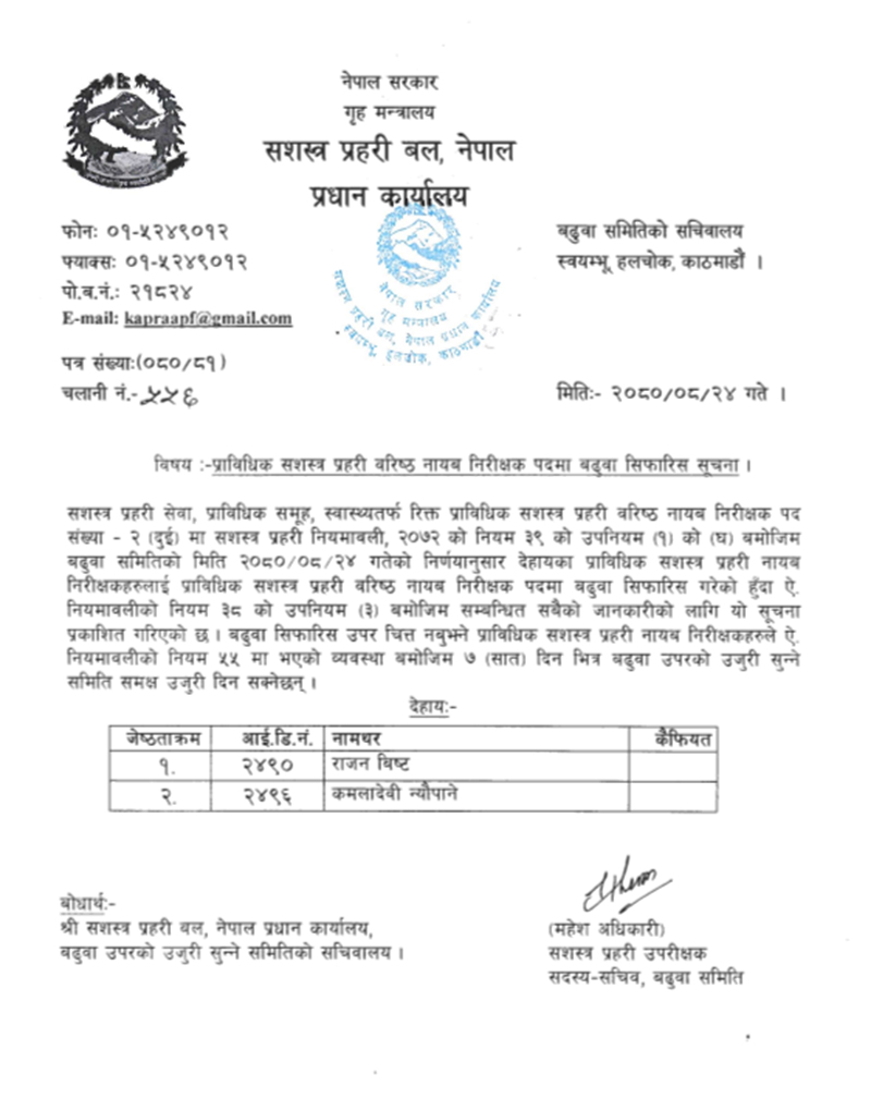 सशस्त्रका अनुसार उक्त सिफारिसभित्र ७ दिनभित्र उजुरी दिन सकिने समेत जनाइएको छ ।