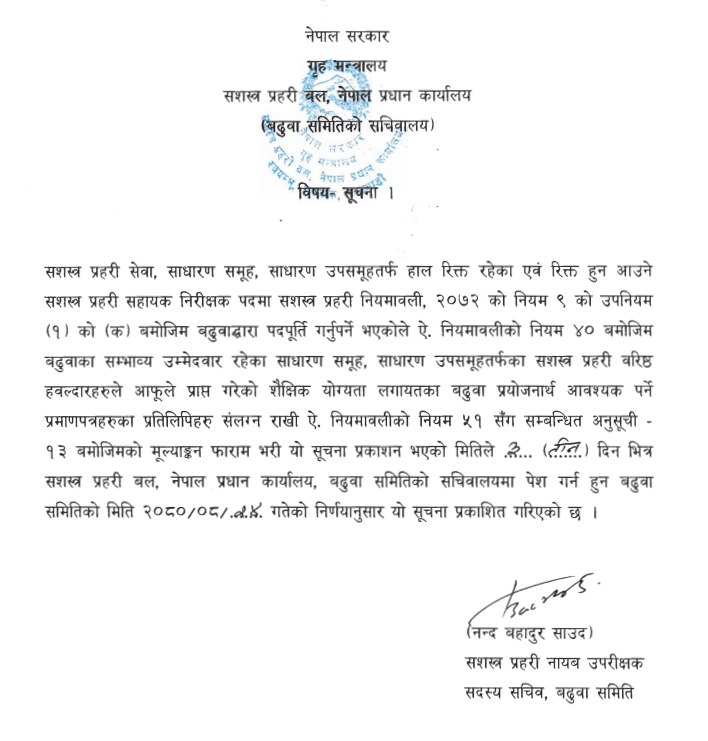 सशस्त्रले निकाल्यो असई बढुवाकाे सूचना, कस्ले कहिलेसम्म मूल्यांकन फारम भर्ने ? (सूचनासहित)