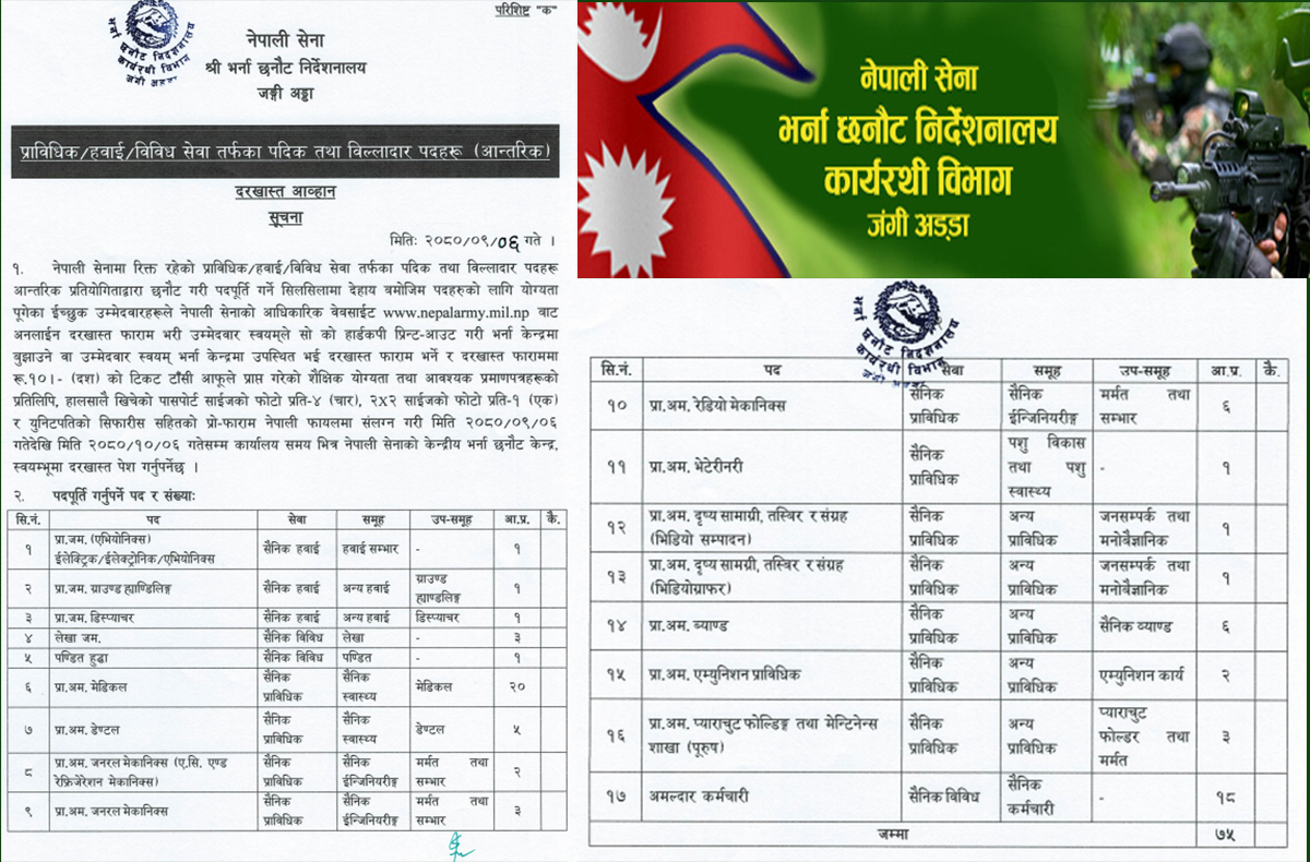 सेनाले माग्यो आन्तरिक दरखास्त, प्राविधिकतर्फ विभिन्न पदका ७५ जना माग (सूचनासहित)