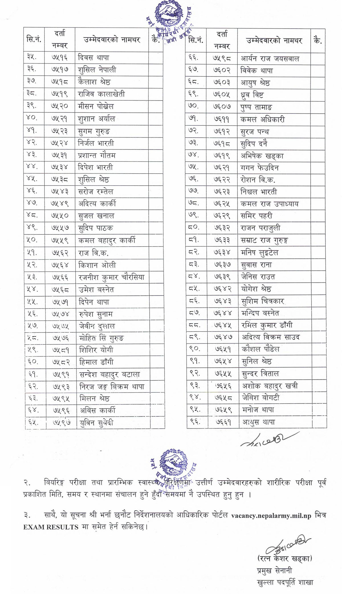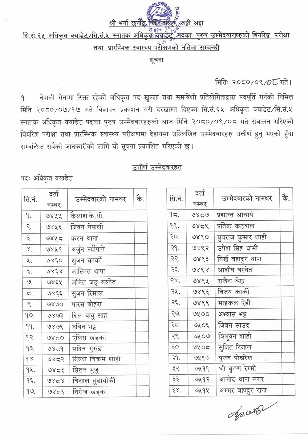 नेपाली सेनाको केन्द्रीय भर्ना छनोट केन्द्रमा भएको सि.सनं. ६५ अधिकृत क्याडेट तथा सि.सं. ५ स्नातक अधिकृत क्याडेट पदको पुरुष उम्मेदवारको नतिजा सार्वजनिक भएको हो ।