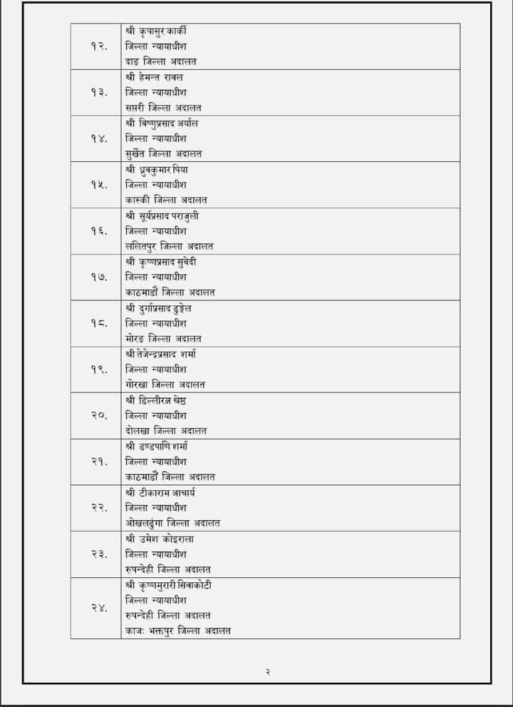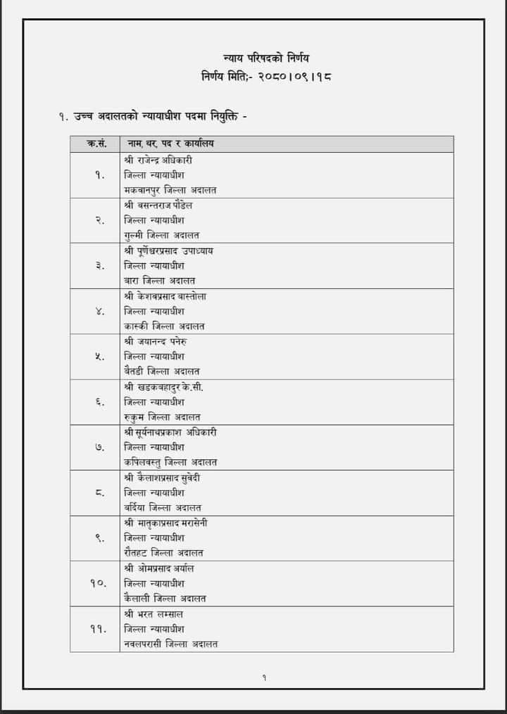 आज बसेको बैठकले जिल्ला अदालतका २६ न्यायाधीश, न्याय, कानुन र सरकारी वकिलबाट ४ कर्मचारी र ९ वकिललाई उच्च अदालतको न्यायाधीश बनाउन सिफारिस गरिएको परिषद् सचिवालयले जनाएको छ।