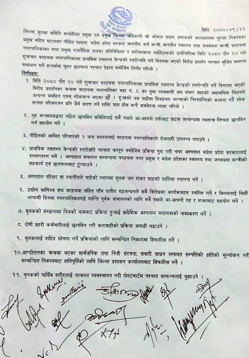 मृतकका परिवार र स्थानीय प्रशासनबीच आज साँझ एघारबुँदे सहमति भएसँगै बरहथवा क्षेत्र शान्त बनेको सर्लाहीका प्रमुख जिल्ला अधिकारी कोमलप्रसाद धमलाले जनाए ।