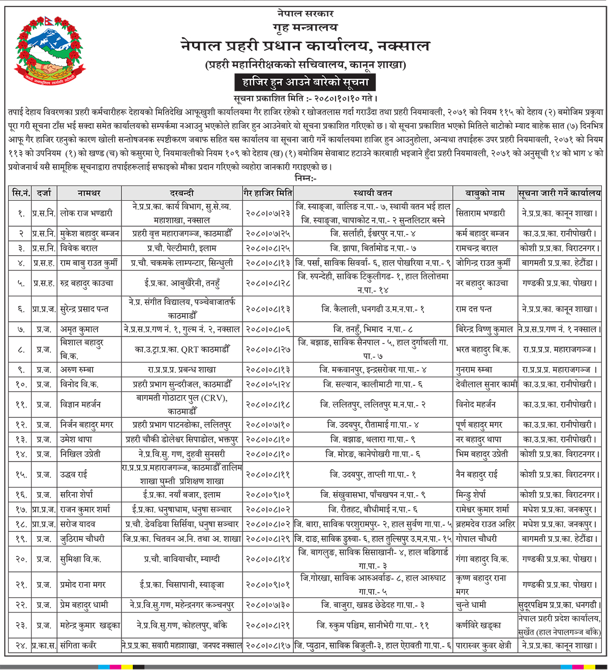 प्रधान कार्यालयका अनुसार देशभरका विभिन्न स्थानमा दरबन्दी रहेर लामोसमयदेखि बिनासूचना कार्यालयमा उपस्थित नभएको भन्दै २४ जना प्रहरीहरुलाई ७ दिन भित्र उपस्थित हुन निर्देशन गर्दै यदि उपस्थित नभएमा सेवाबाट हटाउने समेत जनाएको छ ।