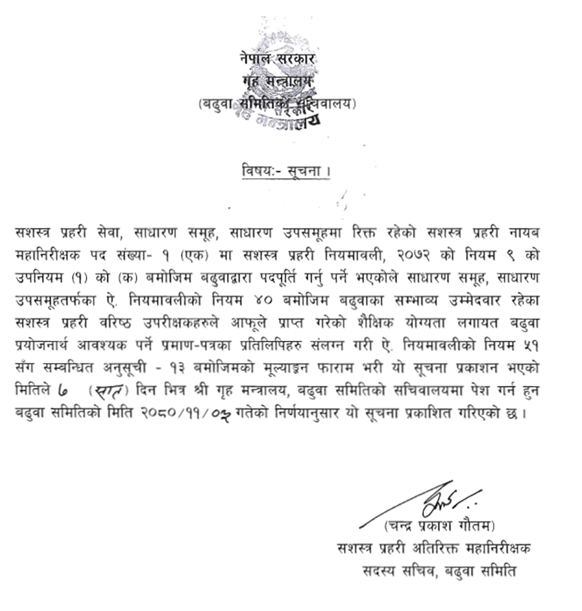 सशस्त्रको डिआईजी बढुवाका लागि सूचना प्रकाशित (सूचनासहित)