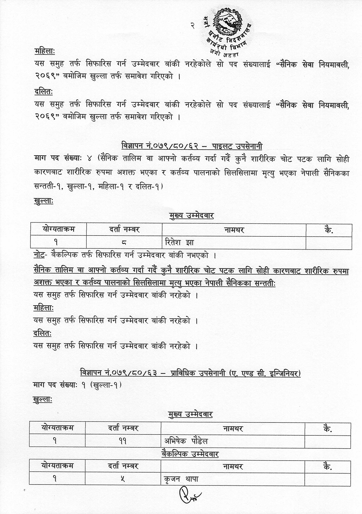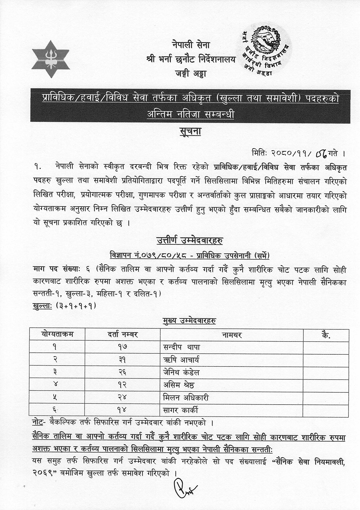 सेनाको भर्ना छनोट शाखाका अनुसार उपसेनानी सर्भेतर्फ ६ जना पास भएका छन् भने पाइटलतर्फ एक जना सिफारिस भएका छन् ।