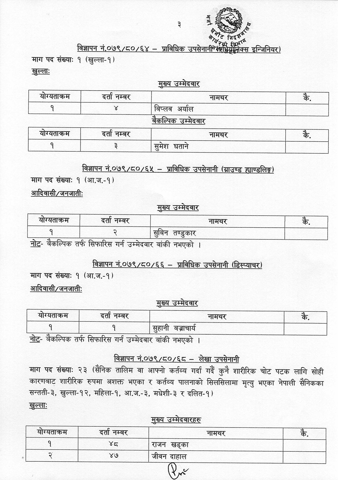 त्यस्तै ए एण्ड सी इन्जिनियर, एभियोनिक्स इन्जिनियर, ग्राउण्ड ह्याण्डलिङ, डिस्प्याचर र लेखा उपसेनानीको नतिजा प्रकाशन भएको हो ।