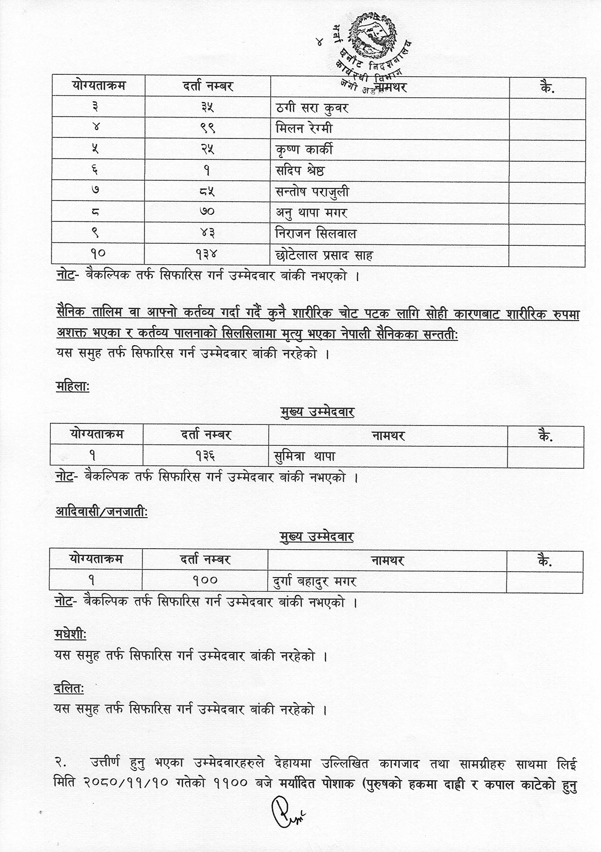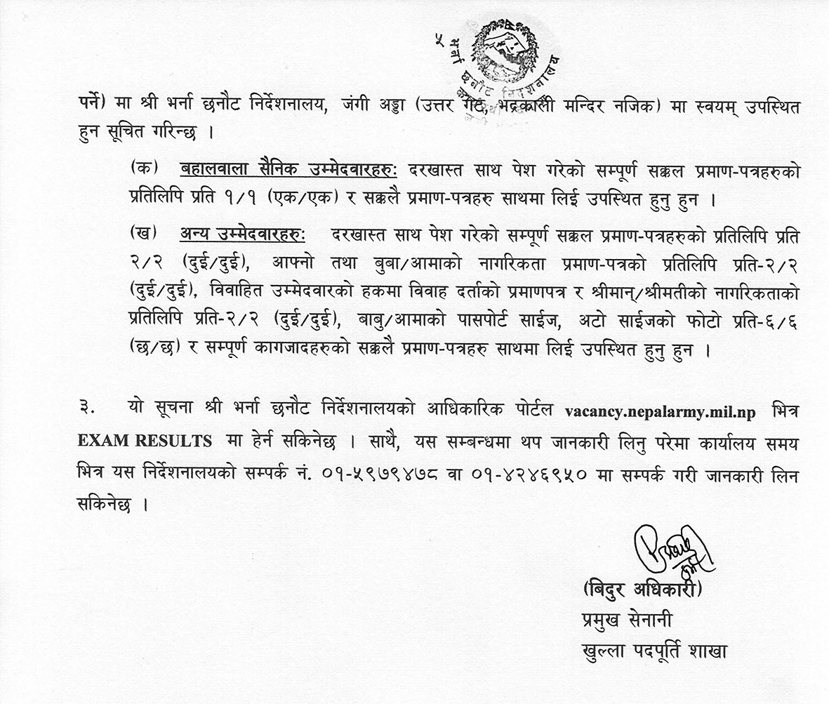 सेनाका अनुसार उत्तीर्ण भएका उम्मेदवारहरुले आफ्नो सक्कल प्रमाणपत्रसहित यही १० गते बिहान ११ बजे भर्ना छनोट निर्देशनालयमा उपस्थित हुन समेत नेपाली सेनाले जनाएको छ ।