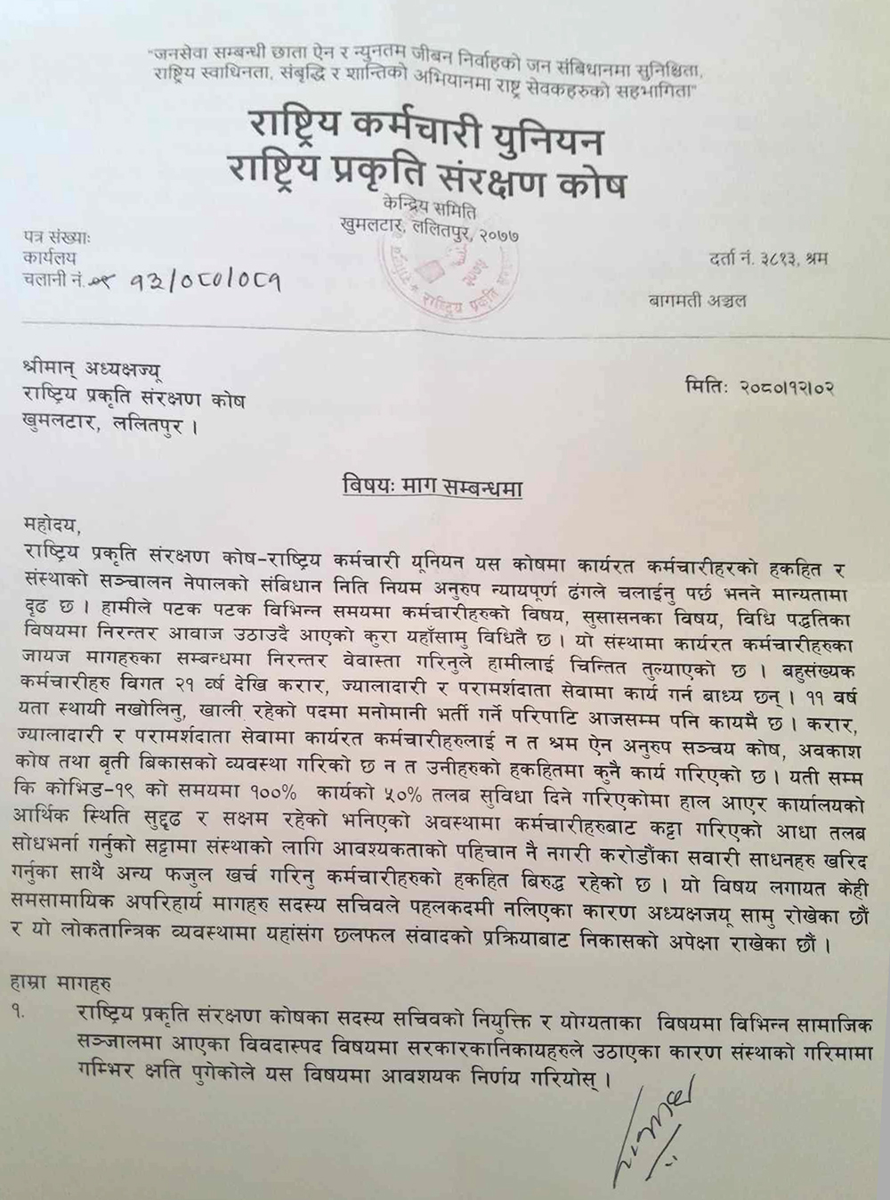 कोभिड–१९ को समयमा कर्मचारीबाट कट्टा गरिएको आधा तलब सोधभर्ना गर्नुको सट्टा करोडौंका सवारी साधन खरिद गर्नु कर्मचारीहरुको हकहितविरुद्ध रहेको समेत उक्त मागपत्रमा जनाइएको छ ।