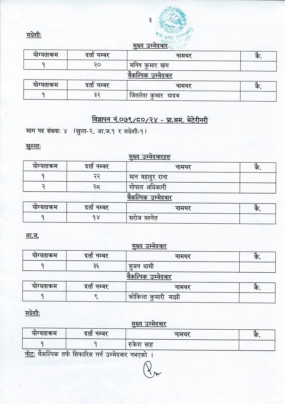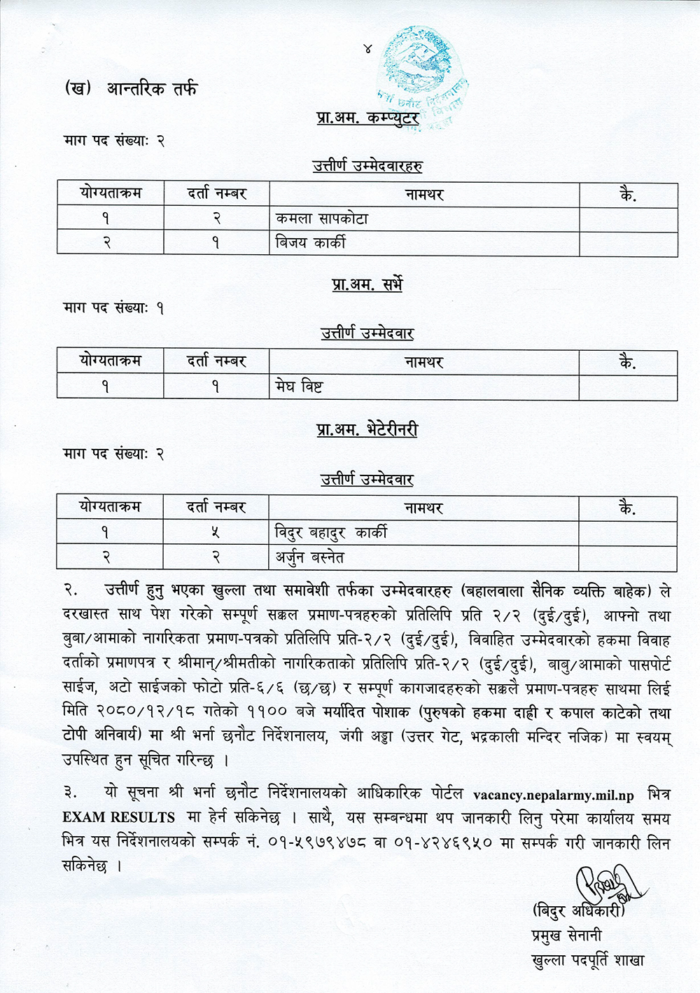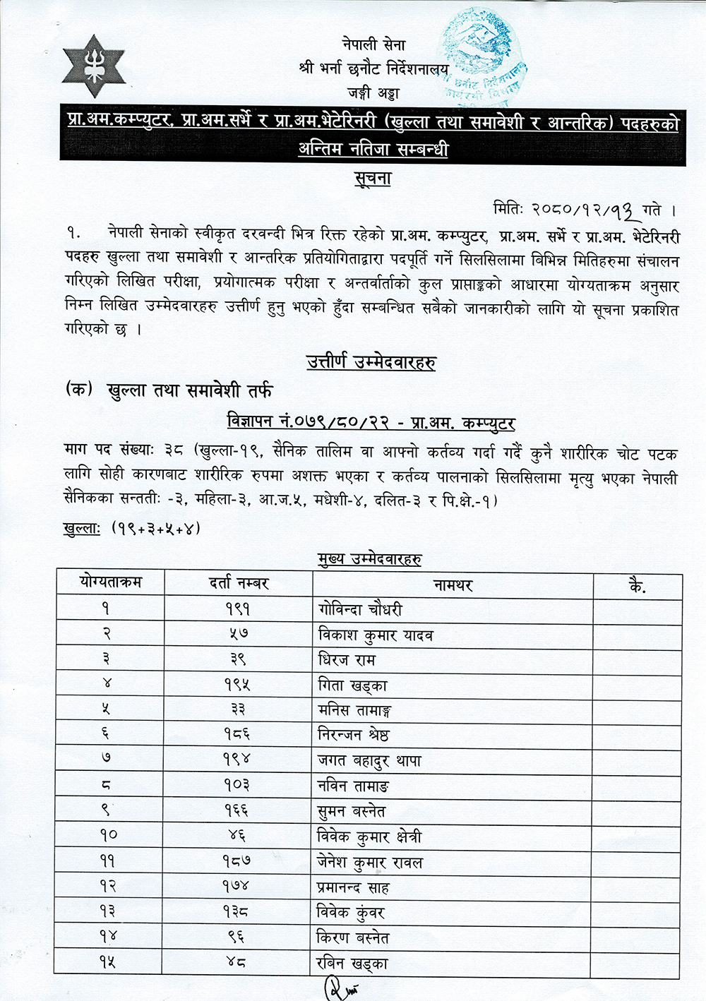 सेनाको भर्ना छनौट निर्देशनालयका अनुसार सेनाको प्रा. अम. कम्प्युटर, प्रा. अम सर्भे र प्रा. अम भेटेरिनरीको खुल्ला तथा समावेशी र आन्तरिक तर्फको अन्तिम नतिजा सार्वजनिक गरिएको हो ।