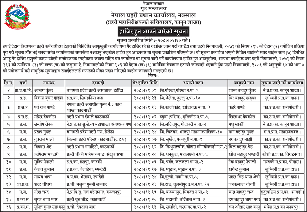 १६ बेपत्ता प्रहरीलाई ७ दिनभित्र हाजिर हुन हेडक्वार्टरको ताकेता