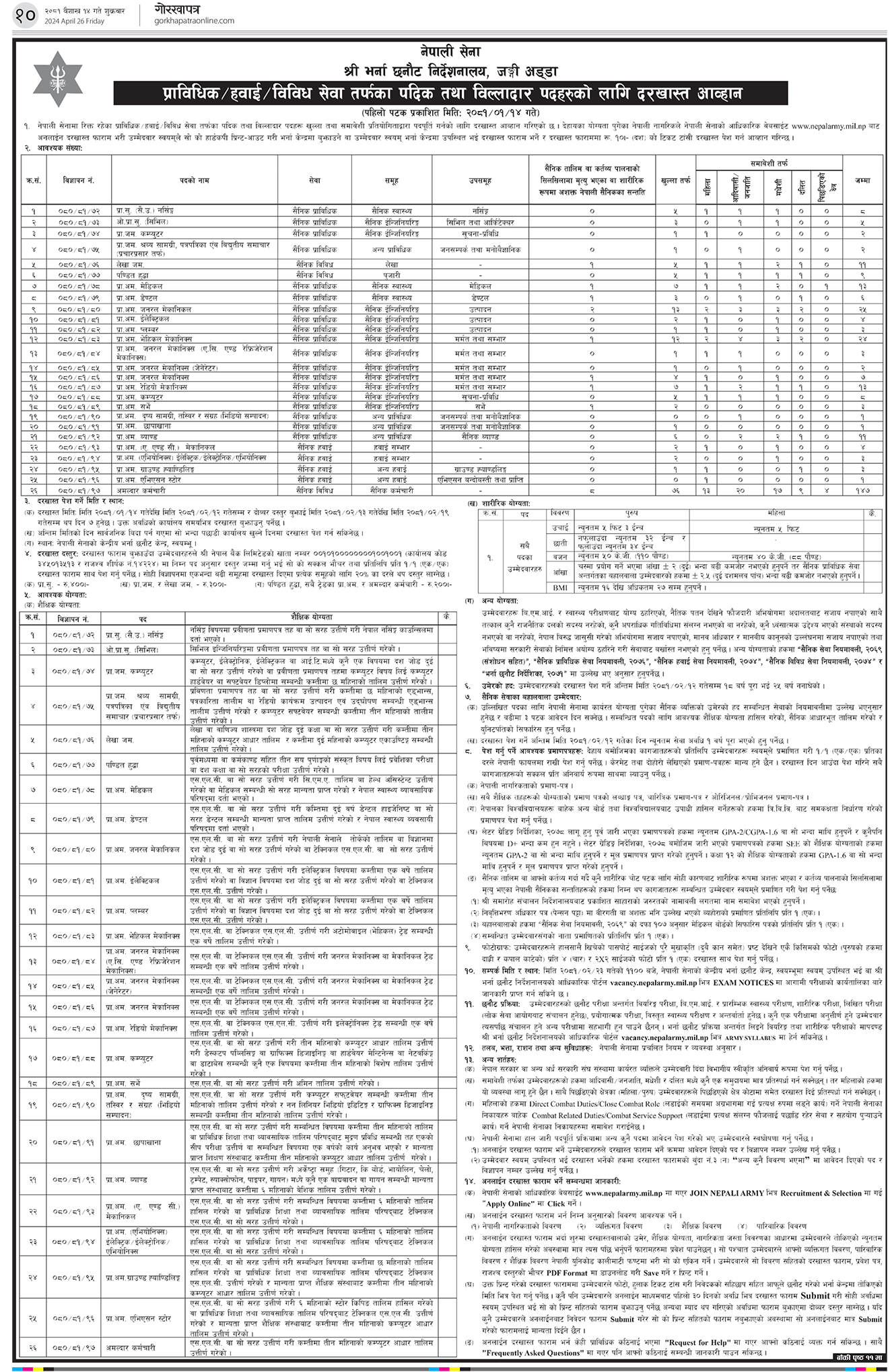 नेपाली सेनाको भर्ना छनोट निर्देशनालयद्वारा जारी सूचनामा प्राविधिक हवाई र विविध सेवा तर्फका पदिक र विल्लादार पदका लागि दरखास्त आह्वान गरिएको हो ।