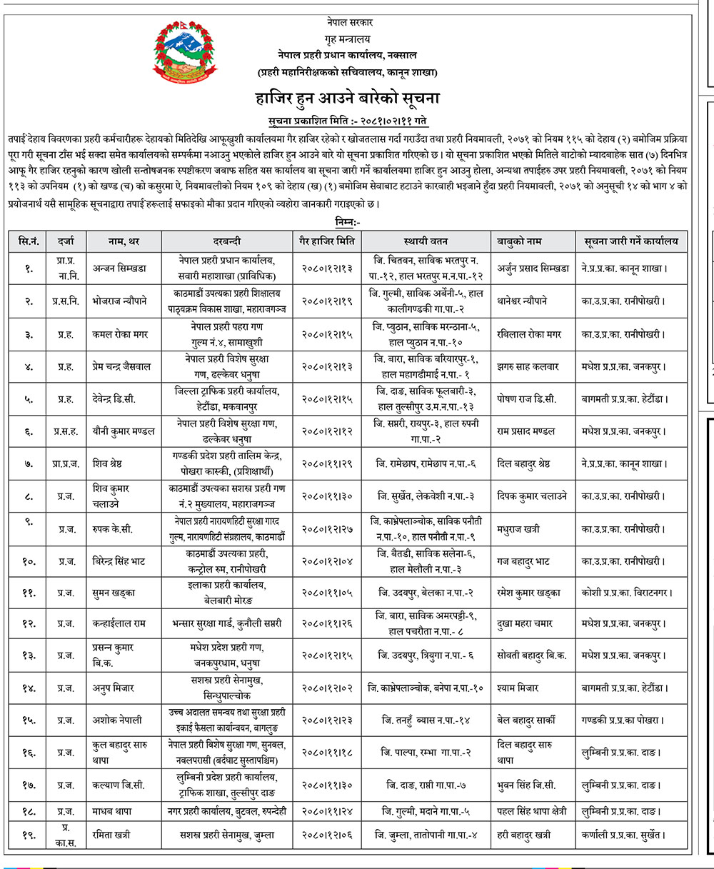 प्रहरीका यी १९ कर्मचारी बेपत्ता, ७ दिनभित्र सम्पर्कमा आउन हेडक्वार्टरको निर्देशन (सूचनासहित)