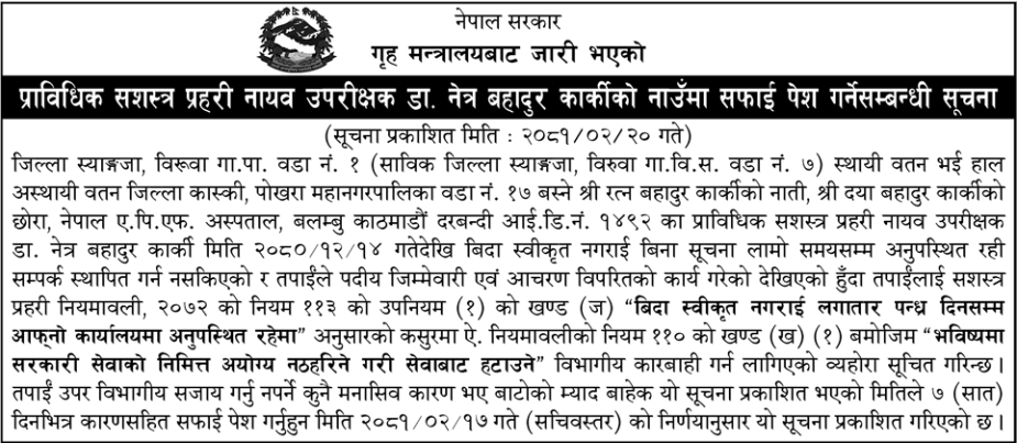 गृहमन्त्रायले सशस्त्र डिएसपी डा. नेत्रबहादुर कार्कीलाई बिना जानकारी कार्यालयमा अनुपस्थित रहेको भन्दै सात दिनभित्र सफाई पेश गर्नका लागि सूचित गरेको हो ।