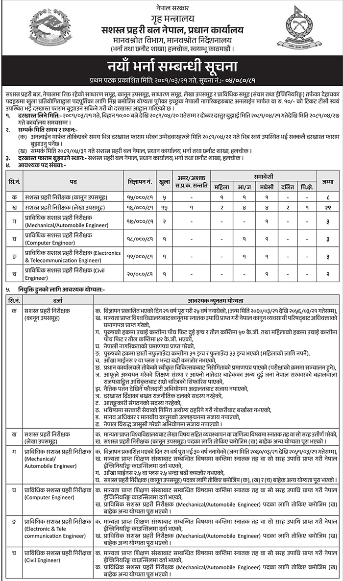 सशस्त्र प्रहरी बल प्रधान कार्यालयका अनुसार सशस्त्र प्रहरीमा रिक्त रहेको साधारण र प्राविधिक तर्फका विभिन्न उपसमूहमा सशस्त्र प्रहरी निरीक्षक (इन्स्पेक्टर)का लागि दरखास्त आह्वान गरिएको हो ।