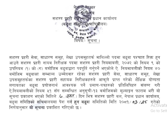 सशस्त्रका अनुसार साधारण समूहको लेखा उपसमूहमा रिक्त रहेका सईका लागि बढुवाको सम्भाव्य रहेका प्रहरी सहायक निरीक्षक (असई) बाट ७ दिनभित्र मूल्यांकन फारम भरी बढुवा समितिमा पेश गर्न सूचित गरेको छ ।