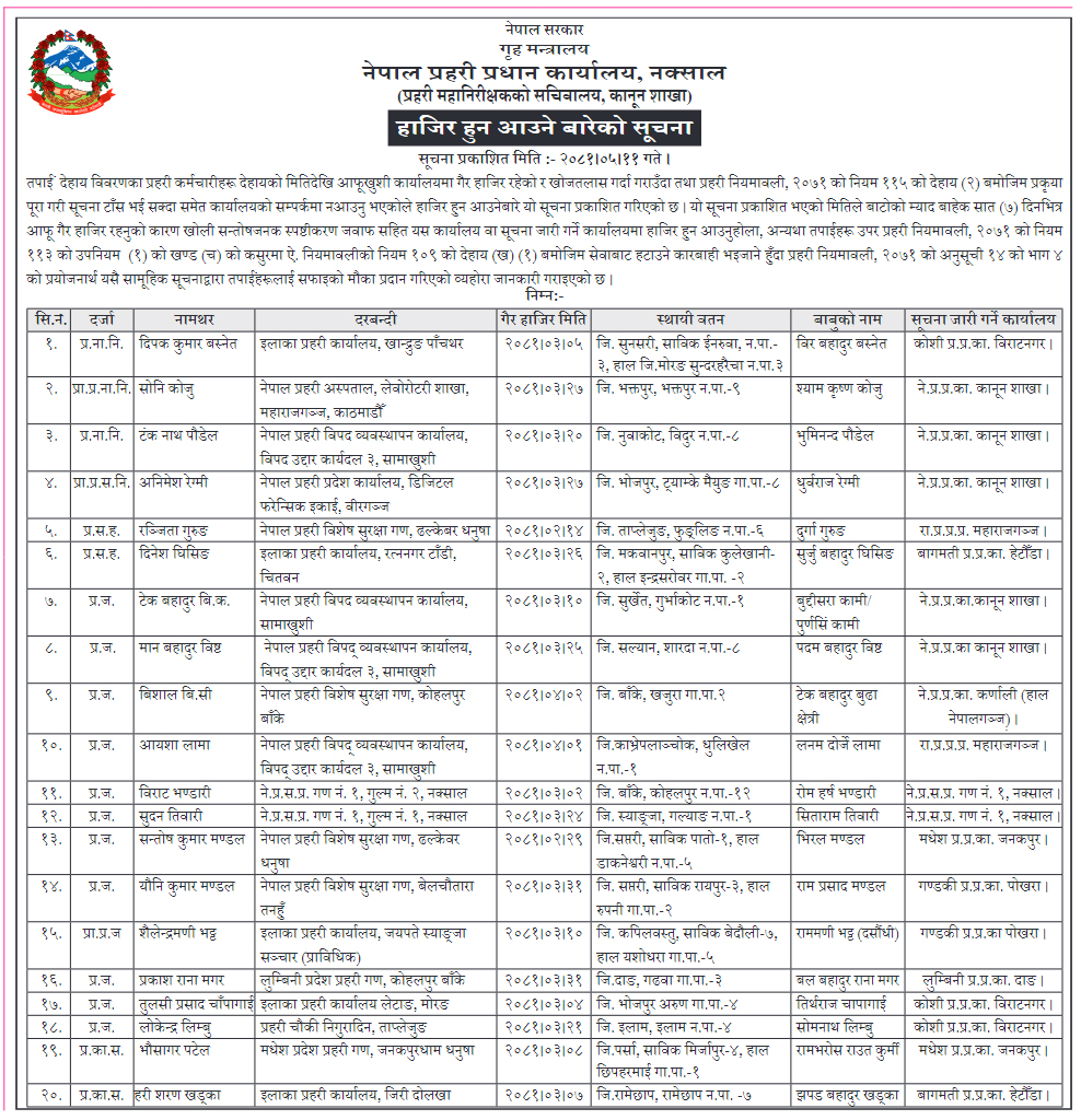 ३ सईसमेत २० प्रहरी सम्पर्कबिहीन, साताभित्र सम्पर्कमा नआए जागिर जाने