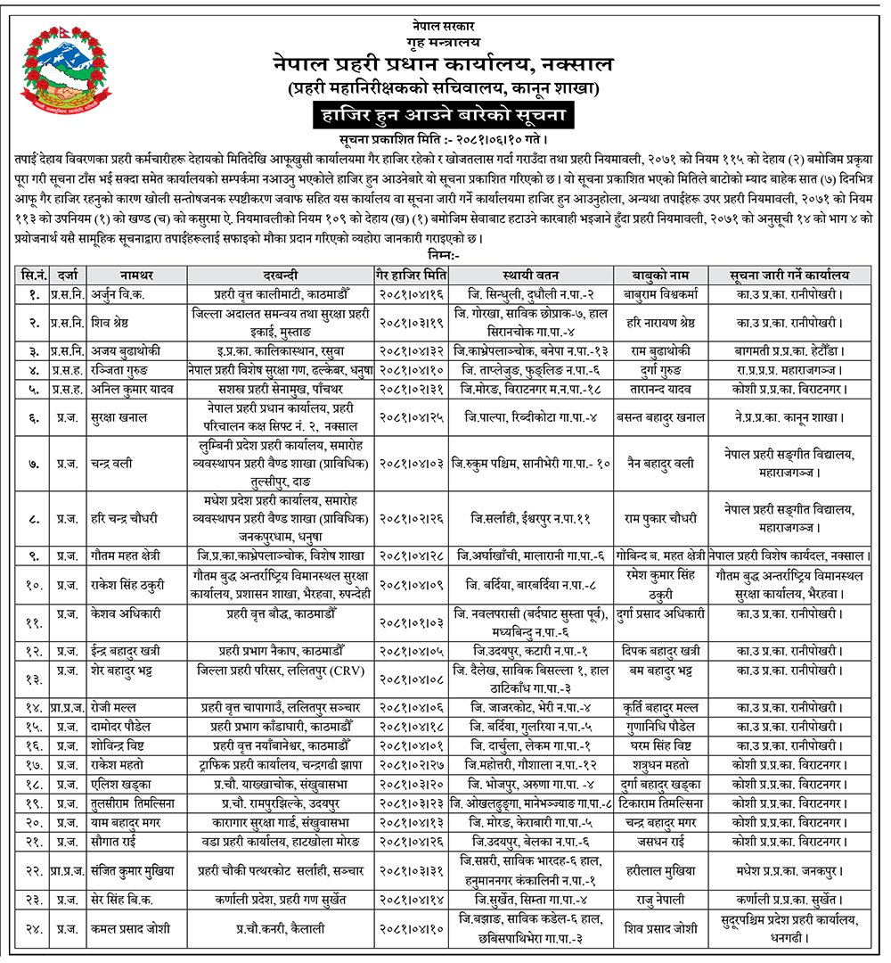 विगत लामोसमयदेखि बिना जानकारी संगठनले खटाएको कार्य क्षेत्रमा उपस्थित नभएको भन्दै हेडक्वार्टरले ७ दिनभित्र स्पष्टीकरणसहित जवाफ दिन प्रहरी सहायक निरिक्षकसहित प्रहरी जवानसम्मका २४ जनालाई निर्देशन दिएको छ ।