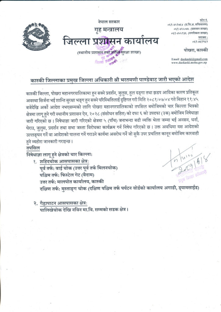 जिल्ला प्रशासन कार्यालय, कास्कीका प्रमुख जिल्ला अधिकारी भरतमणी पाण्डेले आइतबार बिहान ११:४५ बजेबाट लागू हुनेगरी निषेधाज्ञा जारी गरेका हुन् ।
