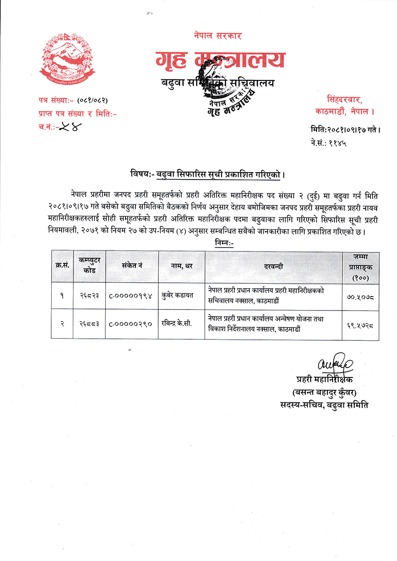 बुधबार बढुवा समितिको बैठकले डिआइजी कुबेर कडायत र रविन्द्र केसीलाई एआइजी बढुवामा सिफारिस गरेको हो। उनीहरु हालका प्रहरी महानिरीक्षक (आइजीपी) वसन्त कुवरका ब्याचमेट हुन् ।