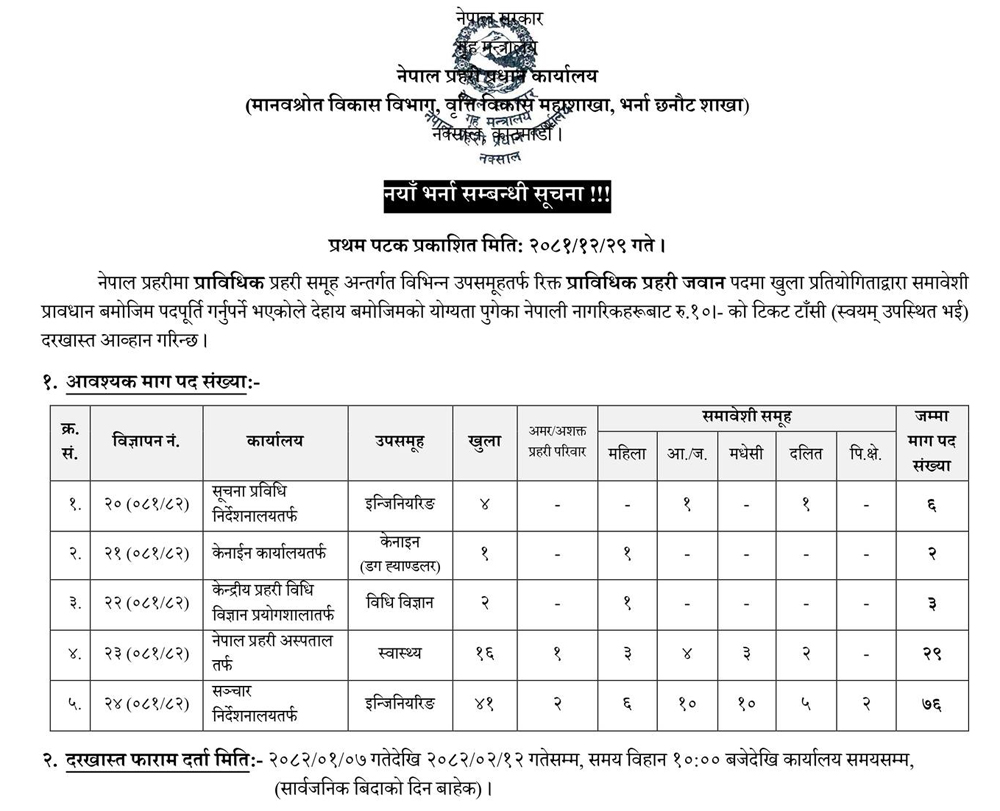 प्रहरी प्रधान कार्यालयका अनुसार प्राविधिकतर्फका विभिन्न उपसमूहतर्फ रित्तः रहेको प्राविधिक प्रहरी जवानका लागि दरखास्त आह्वान गरिएको हो ।