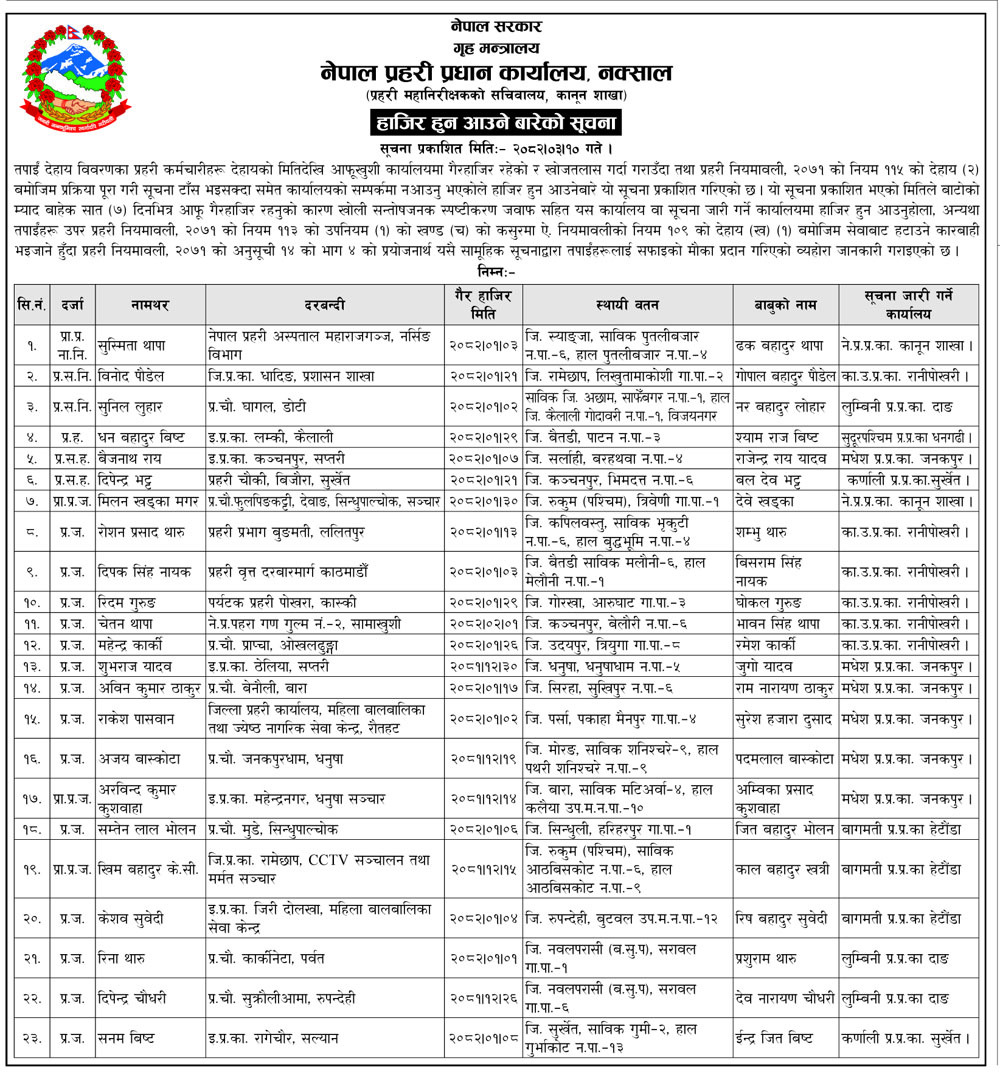 प्रहरीका यी २३ जना सम्पर्कबिहीन, ७ दिनभित्र सम्पर्कमा नआए जागिर चट् !