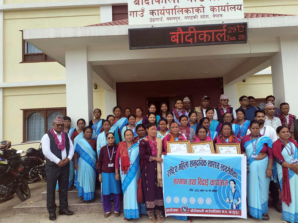 नवलपुर । बौदिकालि गाउँपालिकाले संघीयता पछिको पहिलो पटक विशेष कार्यक्रम गरी लामो समयदेखि समुदायमा स्वास्थ्य सेवा पुर्याउँदै आएका तीन जना महिला सामुदायिक स्वास्थ्य स्वयंसेविकालाई सम्मानसहित बिदाइ गरेको छ।