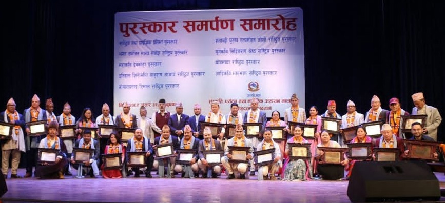 काठमाडौं । संस्कृति, पर्यटन तथा नागरिक उड्डयन मन्त्रालयको आयोजनामा आज काठमाडौंमा आयोजित एक विशेष समारोहकाबीच नौ वटा राष्ट्रिय पुरस्कारहरू वितरण गरिएको छ। नेपाली भाषा, साहित्य, संस्कृति तथा सामाजिक चेतनाका विविध आयाममा उल्लेखनीय योगदान पुर्याएका विशिष्ट स्रष्टा महानुभावहरूलाई यस वर्षको राष्ट्रिय पुरस्कारबाट सम्मानित गरिएको हो।