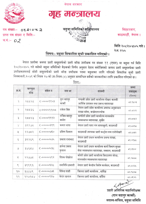 बढुवा समितिका सदस्यसचिव प्रहरी अतिरिक्त महानिरीक्षक (एआईजी) दानबहादुर कार्कीद्वारा जारी विज्ञप्तिअनुसार सिफारिसमा परेका एसपीहरूमा तुलबहादुर कार्की, राकेश सिंह, राजीवबहादुर बस्नेत, कमल थापा, प्रवीण धिताल, प्रकाश रानाभाट, ज्ञानेन्द्रप्रसाद फुयाल, दीपक पोखरेल, दयानिधि ज्ञवाली, दीपेन्द्र शाही र केदार खनाल छन् ।