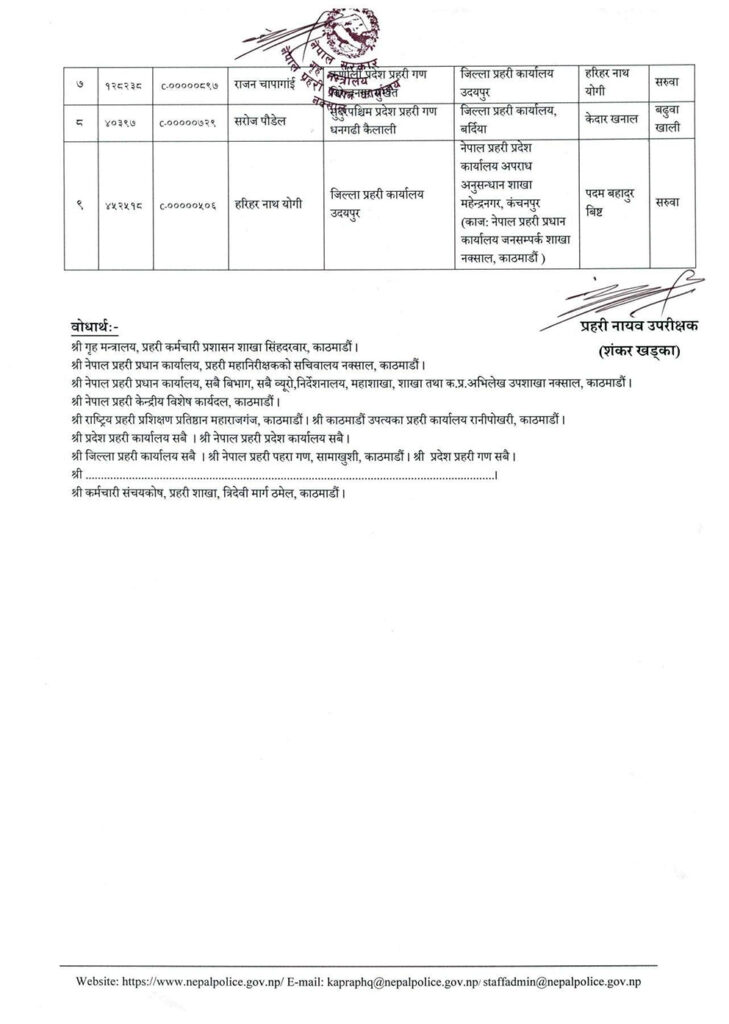त्यस्तै जिल्ला प्रहरी कार्यालय बर्दियामा सरोज पौडेलको सरुवा हुँदा उदयपुरमा राजन चापागाईंको सरुवा भएको छ ।