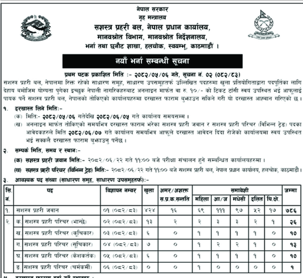 सशस्त्रको भर्ना तथा छनोट शाखाका अनुसार सशस्त्र प्रहरीमा आवश्यक रहेका ७८६ जवानका लागि दरखास्त आह्वान गरिएको हो ।