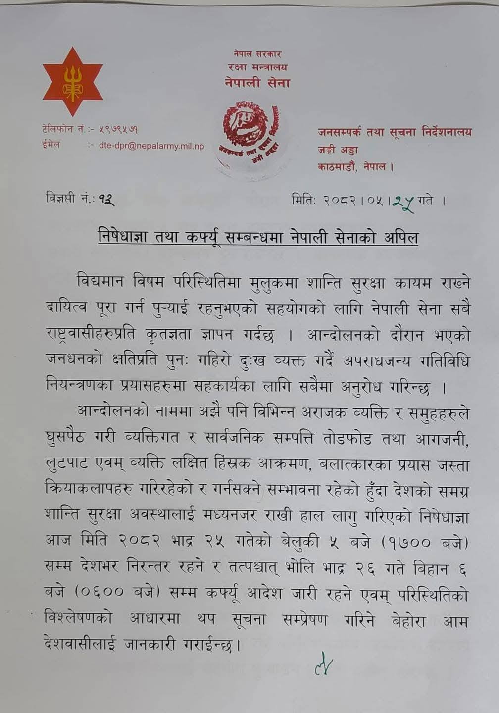 नेपाली सेनाद्वारा देशभर कर्फ्यू आदेश जारी
