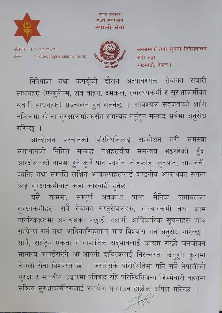 आन्दोलनको नाममा अझै पनि विभिन्न अराजक व्यक्ति र समुहहरुले घुसपैठ गरी व्यक्तिगत र सार्वजनिक सम्पत्ति तोडफोड तथा आगजनी, लुटपाट गरिरहेको सेनाले जनाएको छ ।