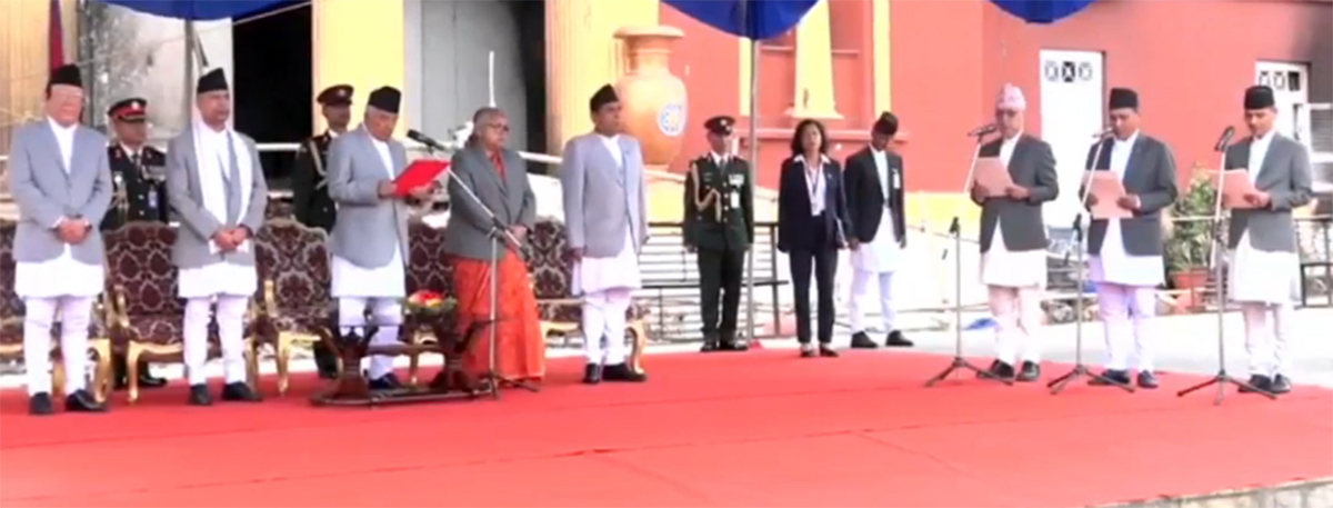 राष्ट्रपति कार्यालय शितलनिवास प्रांगणमा आयोजित विशेष समारोहबीच राष्ट्रपति रामचन्द्र पाैडेलले नवनियुक्त मन्त्रीहरु रामेश्वर प्रसाद खनाल, कुलमान घिसिङ र ओमप्रकाश अर्याललाई सपथग्रहण गराएका हुन् ।