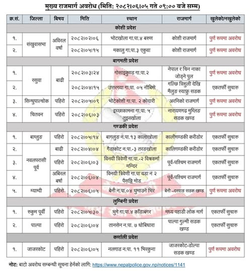 काठमाडौं । नेपाल प्रहरीले हाल देशका विभिन्न राजमार्गहरू पूर्ण रूपमा अवरुद्ध रहेको जानकारी गराएको छ। बिहान ९ बजेसम्मको तथ्यांकअनुसार, कोशी, बागमती, गण्डकी, लुम्बिनी र कर्णाली प्रदेशका विभिन्न स्थानमा सडकहरू अवरुद्ध भएका छन्।
