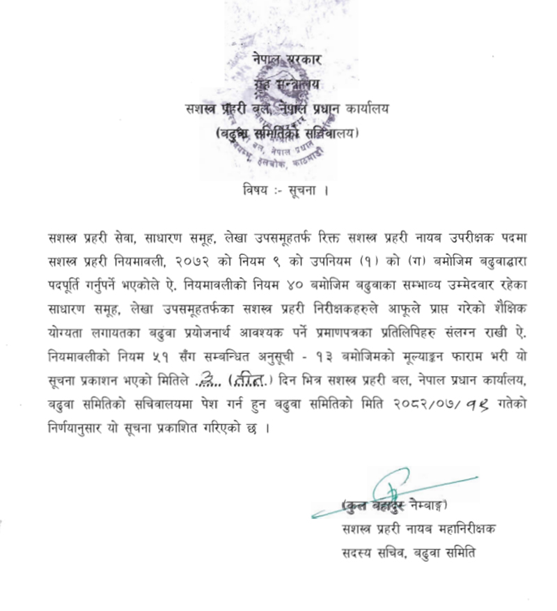 डिएसपी बढुवाका लागि सशस्त्रले माग्यो आवेदन (सूचनासहित)